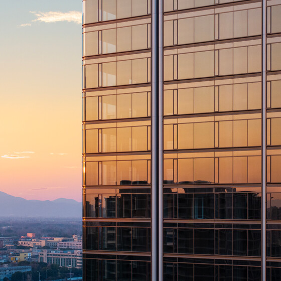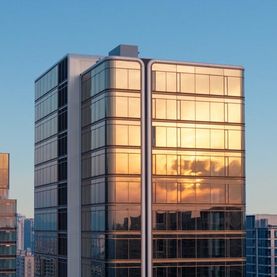 【特色地标建筑 】以 “金玉镶嵌” 为设计灵感,采用古铜色铝板、大面积中空 LOW - E 玻璃等材料,建设近百米高的公建化建筑群体。