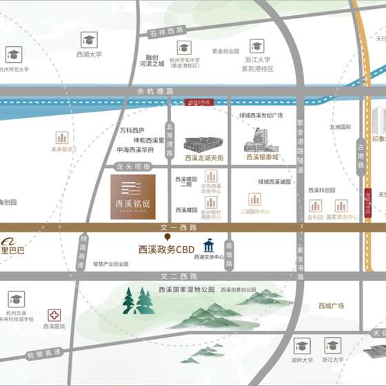备注:本项目距西溪湿地直线距离约1公里;项目位于文一西路上,向东直线约2.4公里到未来科技城的阿里巴巴淘宝城园区;以上数据来源于百度地图测量工具的直线距离。